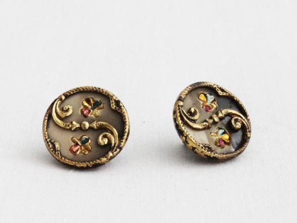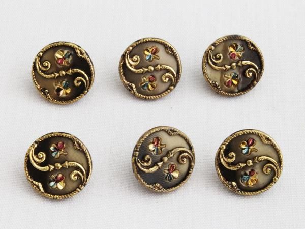 唐草模様風の縁飾りの間に小花をあしらえた上品なボタンです。、