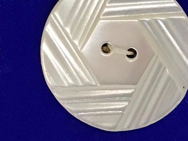 丸型の白蝶貝の表面に6角形を囲み斜線に模様を入れたモダンなボタンです。