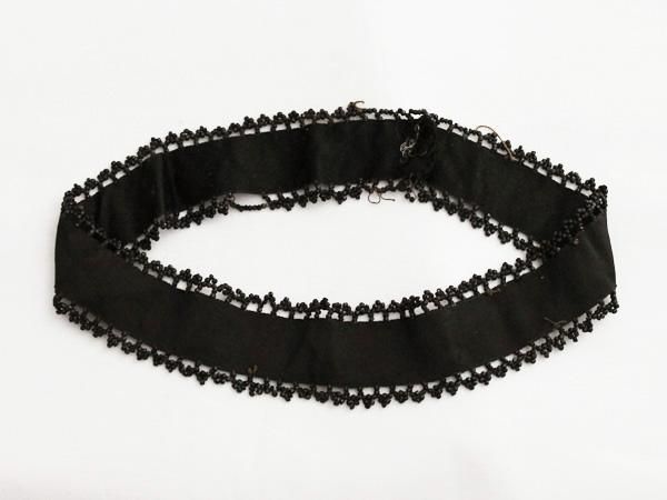 巾2.3cmのグログランリボンの両端にケシガラスビーズで小花型の縁飾りが付けられています。