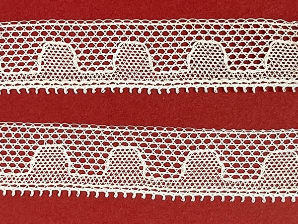 網模様の大きさを変えて山模様を作り上げ裾にはピコットが付いています。